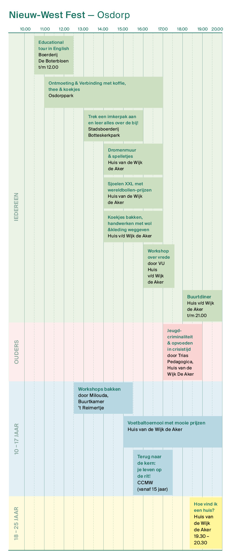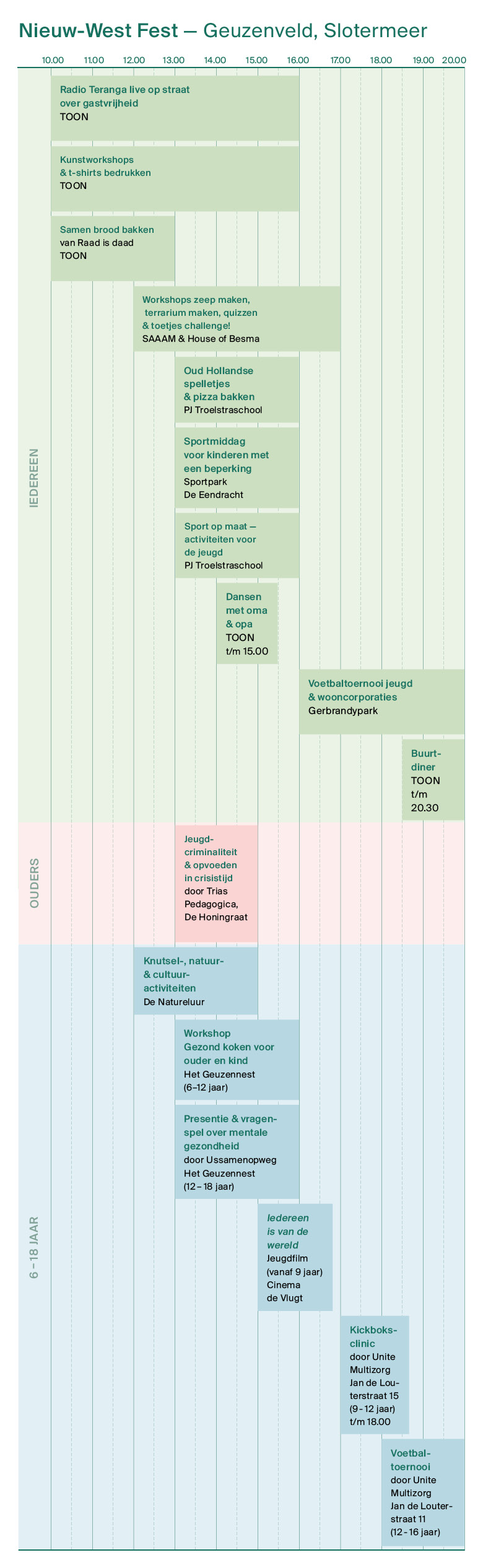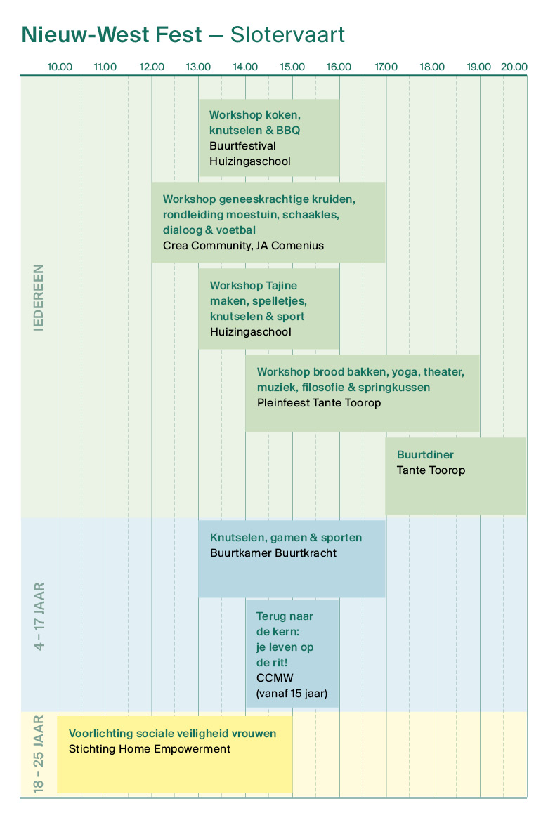 Verspreid door heel Nieuw-West worden activiteiten georganiseerd: van sport en creatieve workshops tot buurtmaaltijden, optredens en ontmoetingen tussen jong en oud. Alles draait om verbinding en inspiratie. Het blokkenschema geeft een overzicht van wat er allemaal te doen is.