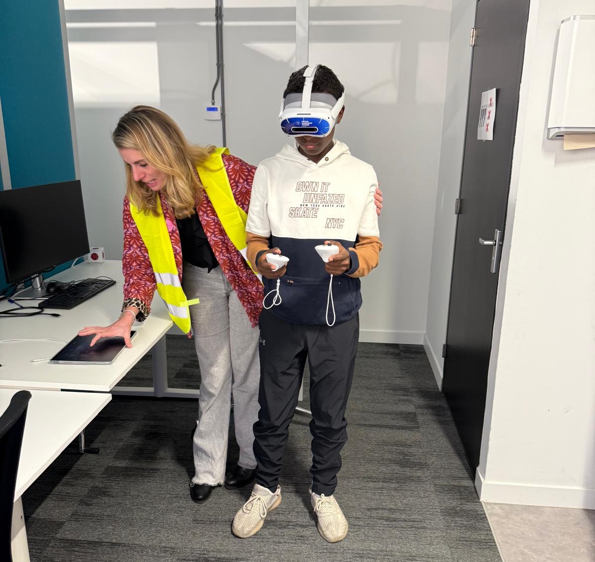 De populairste tool van de dag is zonder twijfel de VR-bril met joystick. Daarmee kun je ervaren hoe het is om te werken in de logistieke sector. Iedereen wil hem uitproberen. Peter vertelt lachend: “Ik zie een lange gang en probeer iets op te pakken, maar dat valt nog niet mee!” Even later vertelt hij dat hij eigenlijk al werk heeft dat hierop lijkt. “Ik kwam eigenlijk af op de muziek,” zegt hij, “maar ben blij dat ik even binnen ben gaan kijken.”