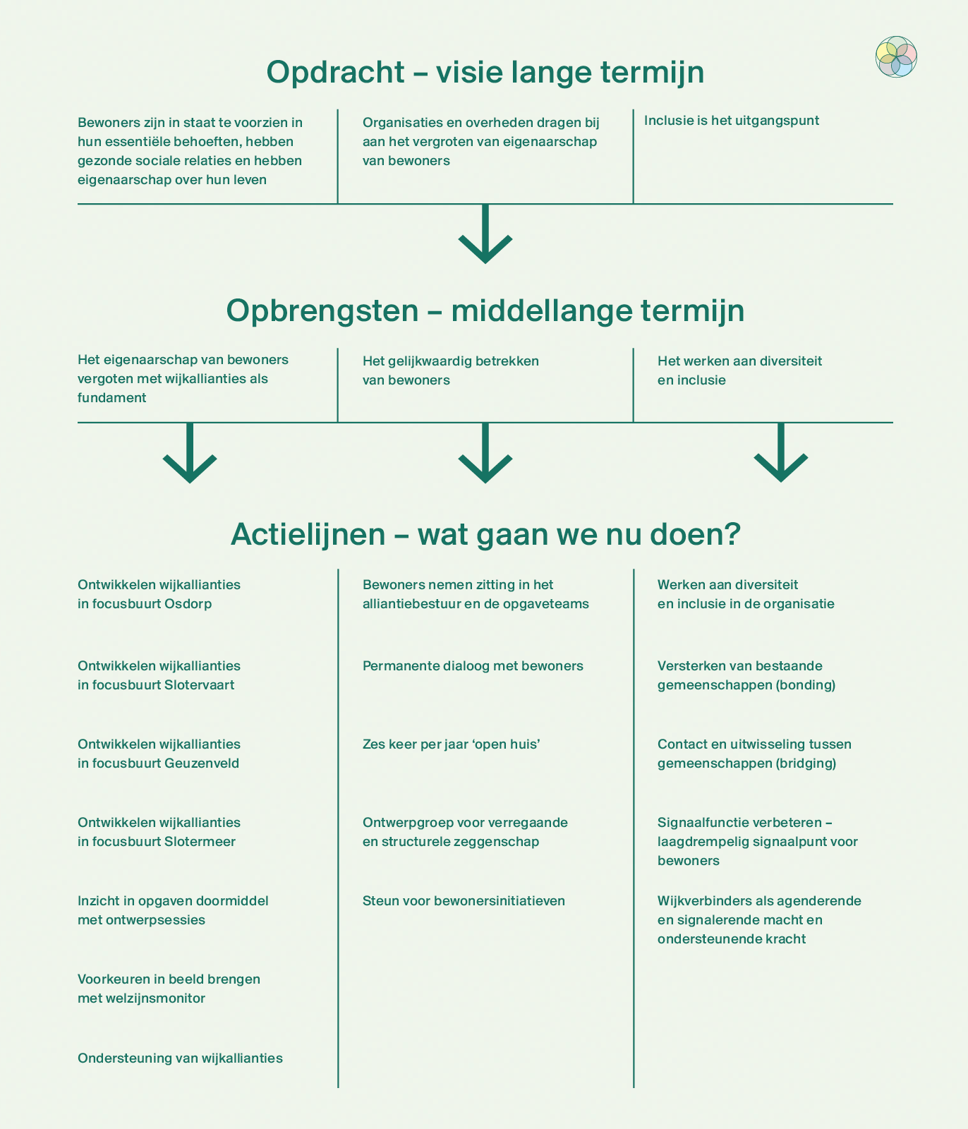 Bewoners in Amsterdam Nieuw-West hebben controle over hun eigen leven, hun werk en de omgeving waarin ze wonen. Ze voelen zich thuis en welkom in hun buurt en kennen er de mensen. Bewoners, overheden en (maatschappelijke) organisaties werken gelijkwaardig samen aan de toekomst van Amsterdam Nieuw-West.