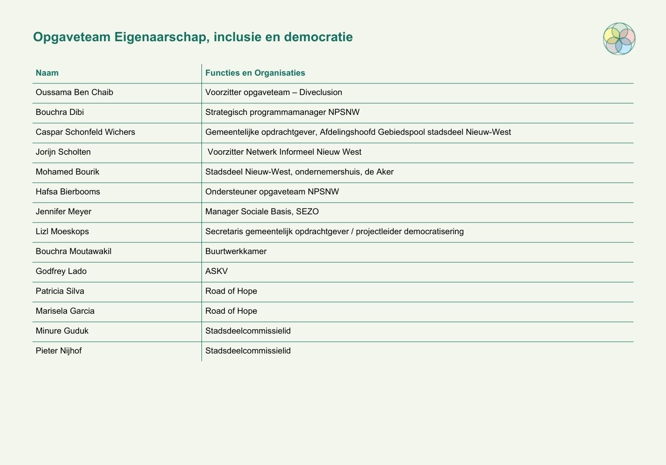 We brengen overheid, bewoners en (maatschappelijke) organisaties bij elkaar om samen plannen te maken, beslissingen te nemen en uit te voeren. Dit doen we vanuit een opgaveteam, dat per onderwerp kan verschillen van samenstelling. Bewoners krijgen op deze manier meer verantwoordelijkheid en controle over de veranderingen in hun buurt. In alles wat we doen, staat de bewoner van Amsterdam Nieuw-West voorop. Alleen op die manier maken we het een samenleving van, voor, met en door bewoners.