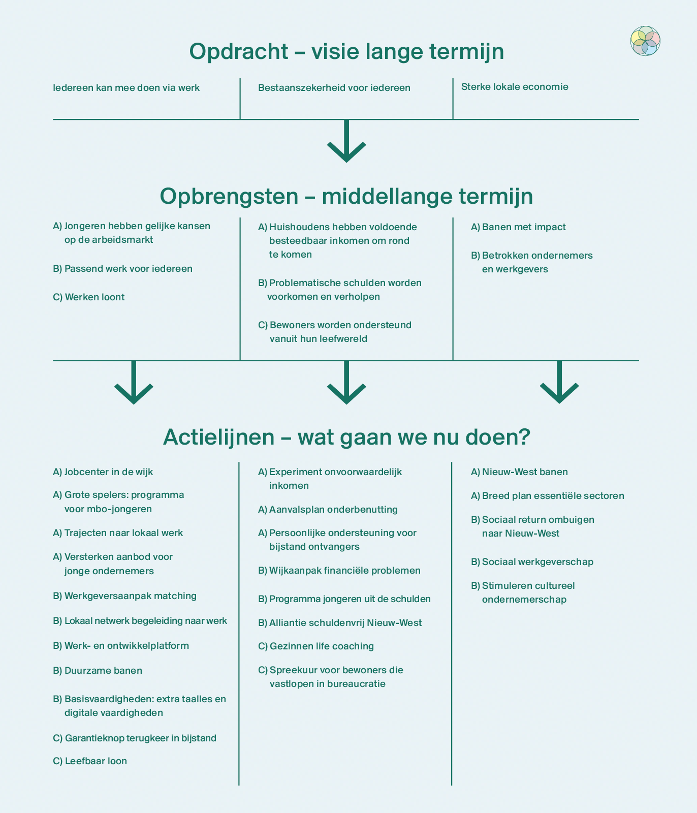 In het schema hieronder staan de stappen die we de komende tijd concreet met elkaar zetten om onze doelen te bereiken. Een actie kan klein en heel gericht zijn, of juist breder met veel verschillende opbrengsten. Alle acties bij elkaar zorgen voor meer werkgelegenheid en bestaanszekerheid voor de mensen in Nieuw-West, en in het bijzonder voor de jongeren. Je leest er meer over in het uitvoeringsprogramma.